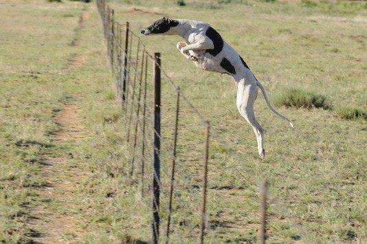 mit einigen Sätzen (der Greyhound hat innerhalb von 3 Sprüngen auf 50 km beschleunigt) mit Leichtigkeit über den Zaun gesprungen und dem Wild hinterher.