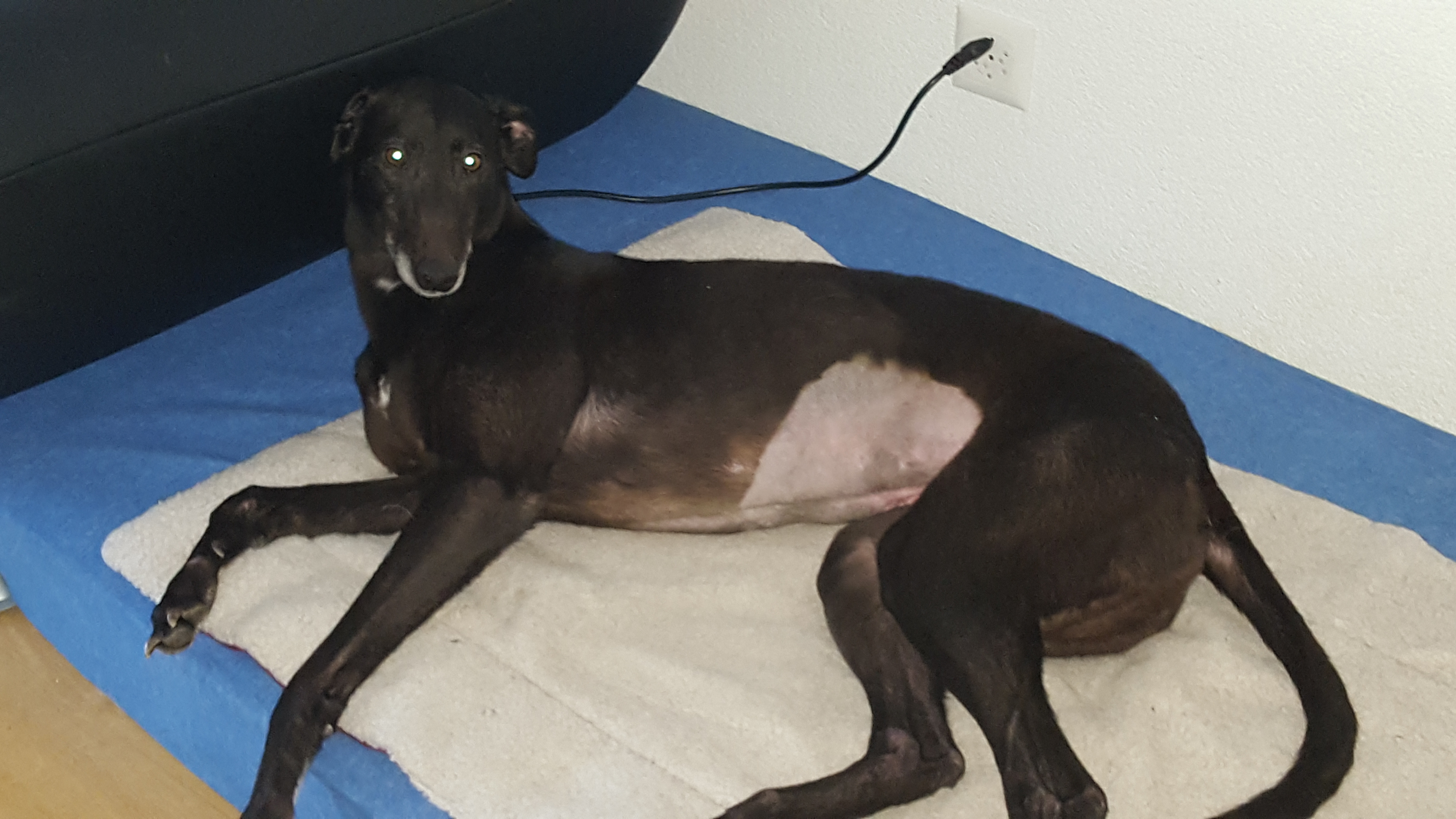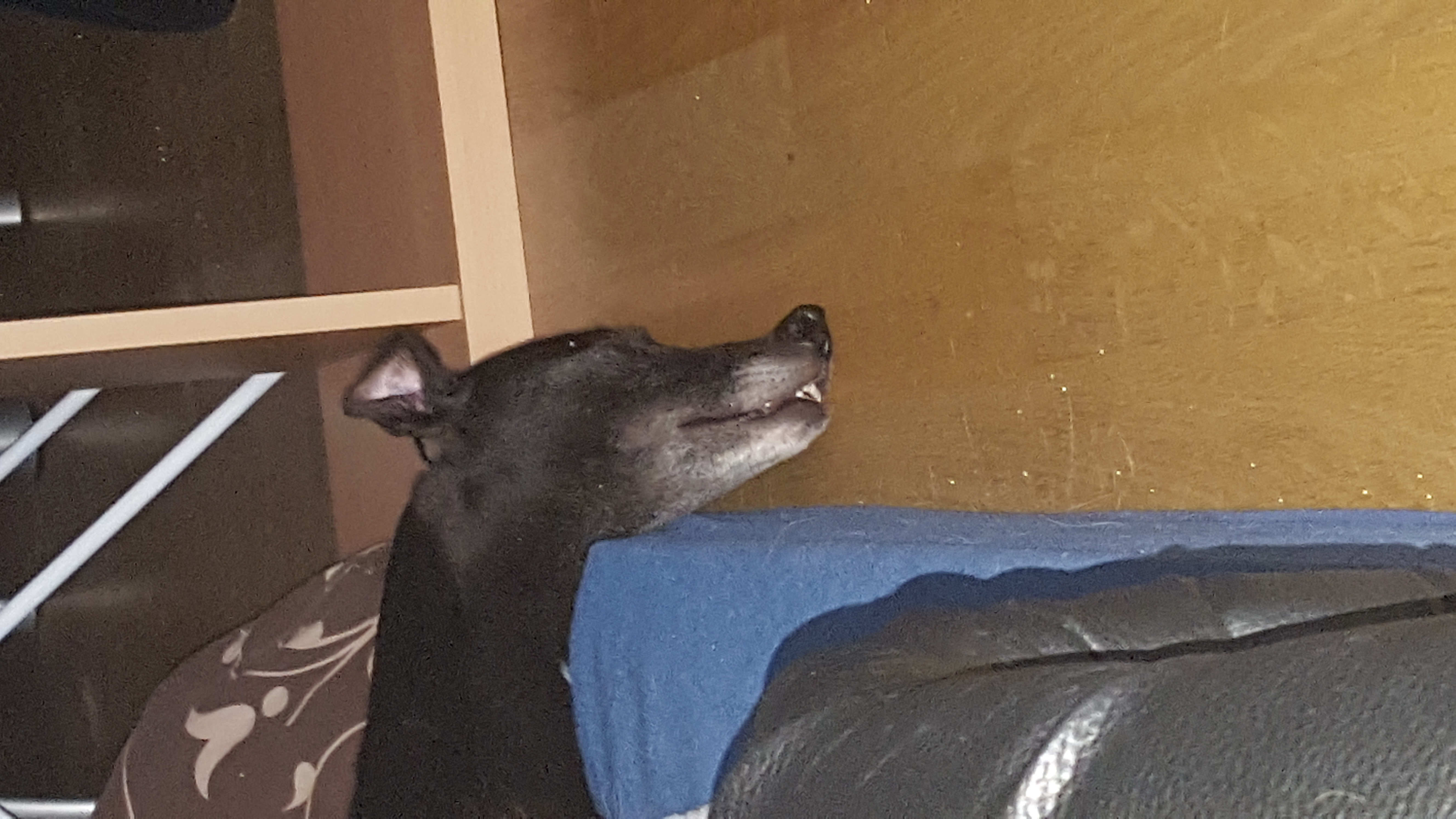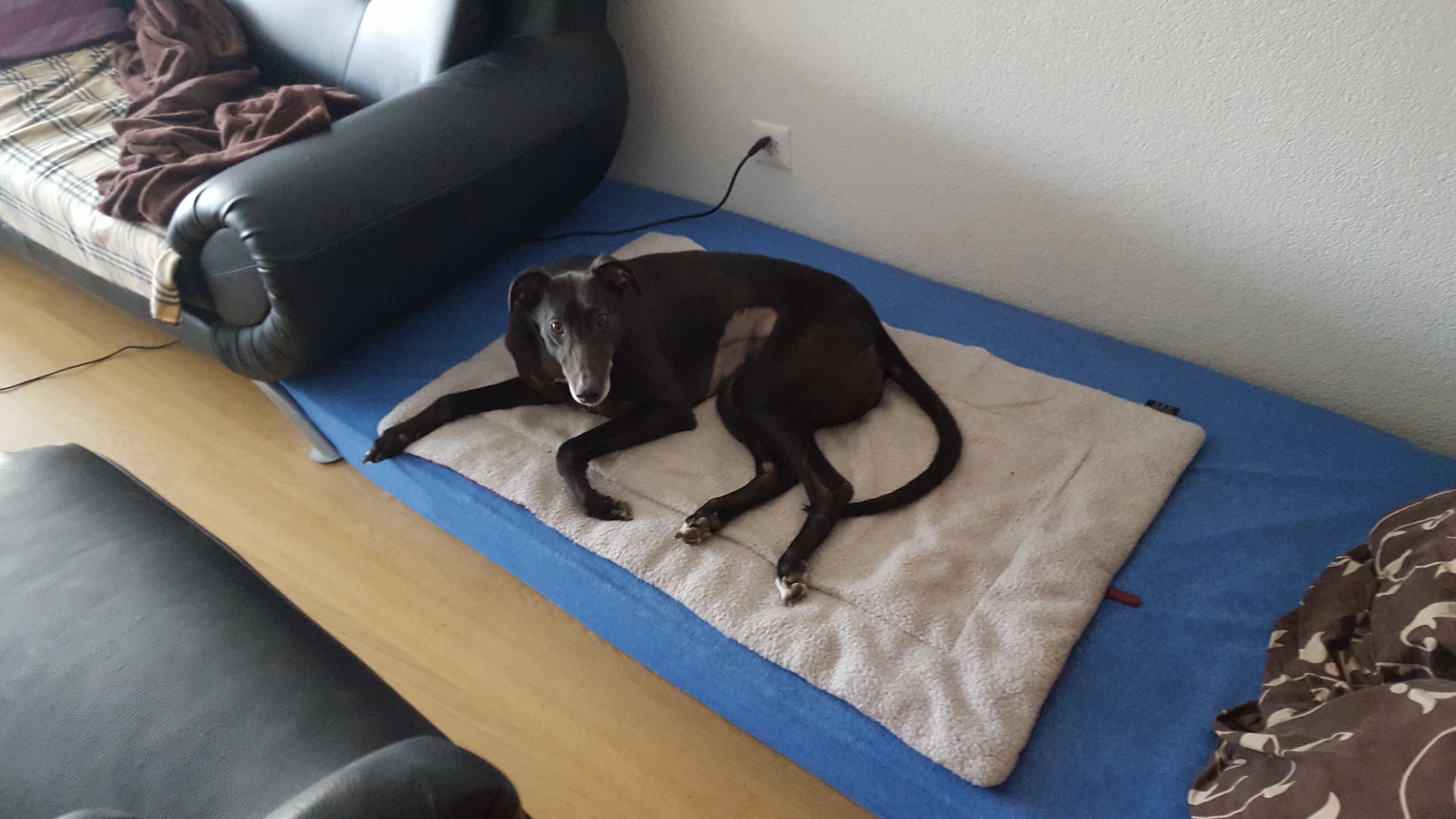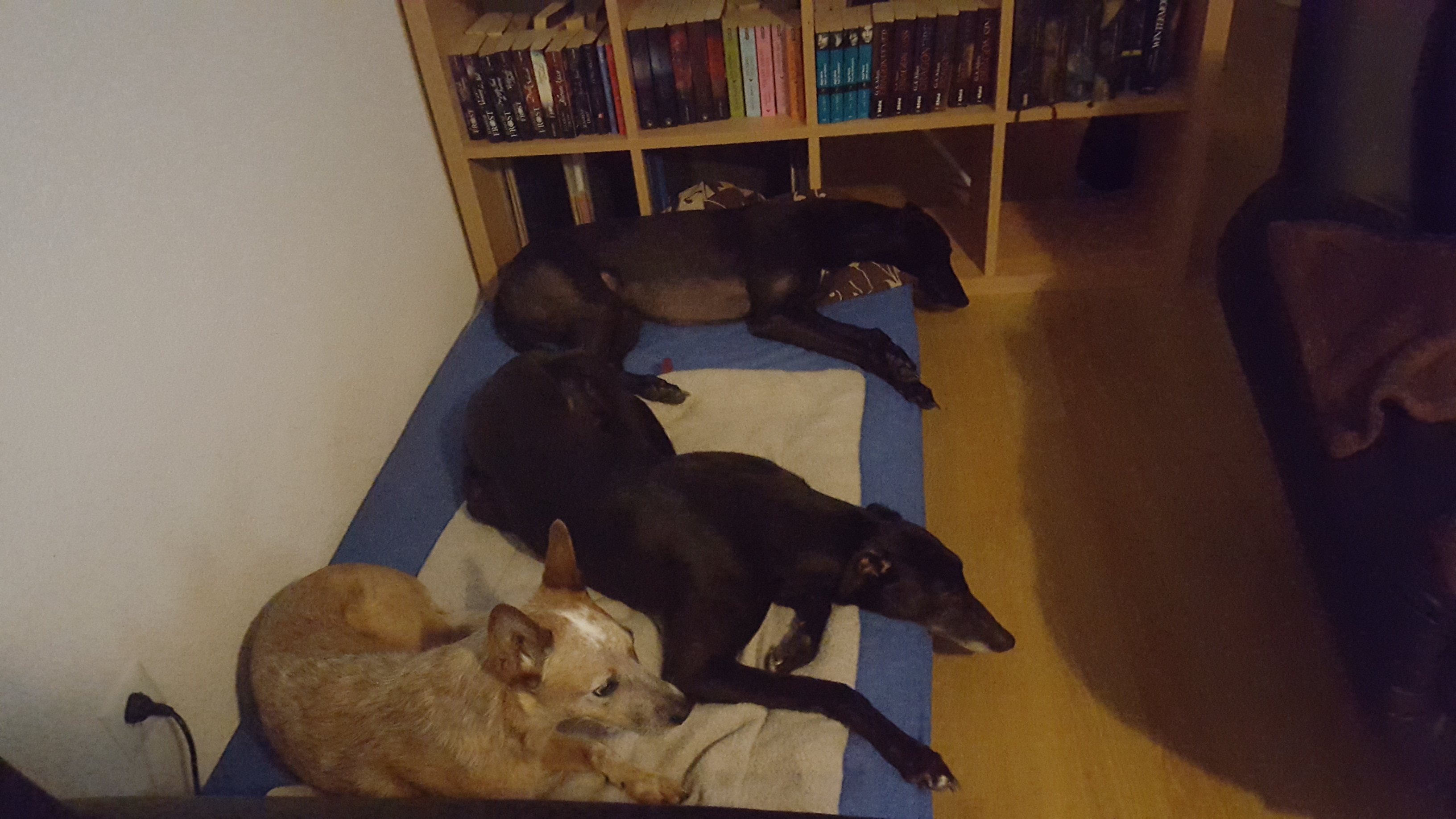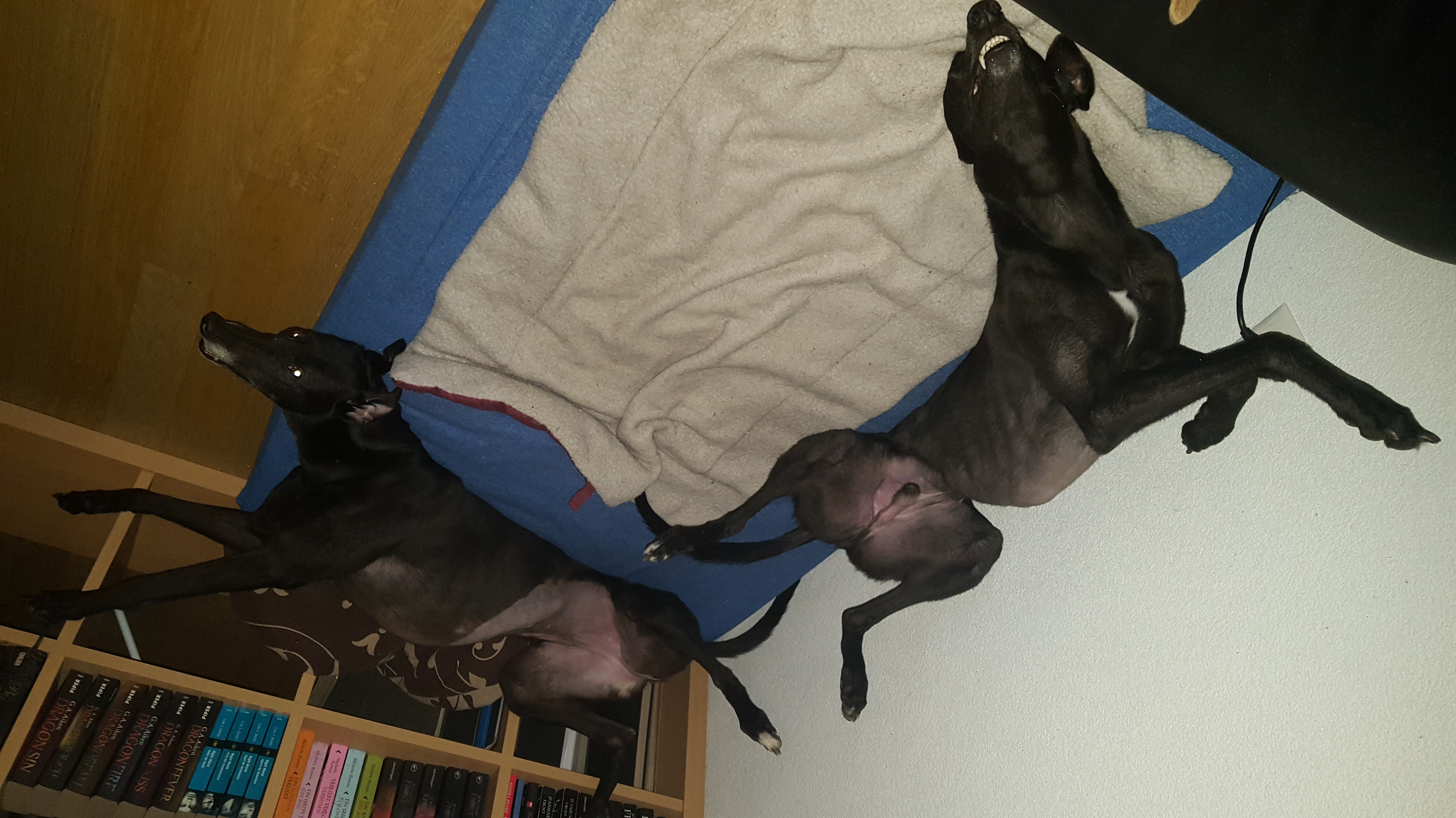 Mit meinen zwei Hunden Anubis (ebenfalls ein schwarzer Grey) und Dira (die aktive Cattle Dame) versteht sie sich sehr gut.