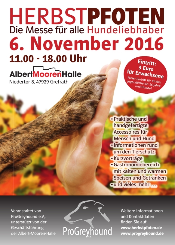 Das Team von ProGreyhound bedankt sich bei allen Ausstellern und Besuchern unserer Messe „Herbstpfoten 2018“ ganz herzlich für Ihre Teilnahme und Ihren Besuch und beim Hallenpächter, Herrn Karpenkiel, für die tolle Unterstützung, die er uns auch in diesem Jahr wieder gewährte.