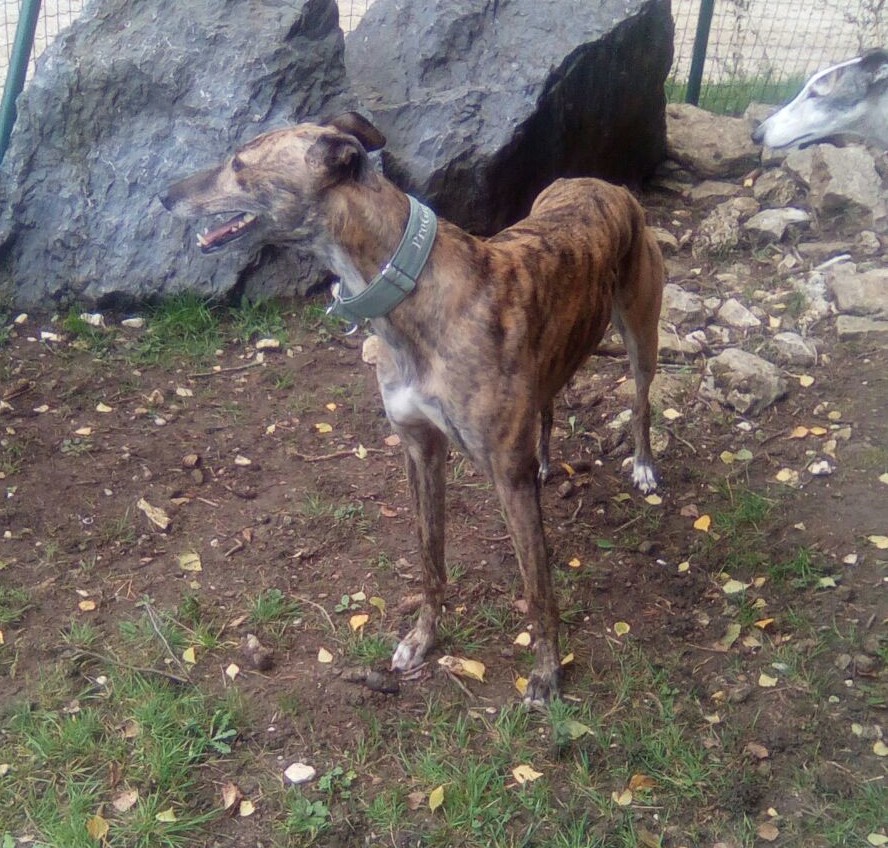 Maeve geht ruhig und leicht an der Leine, hat aber den für Greyhounds typischen Jagdtrieb und kann nicht abgeleint werden.