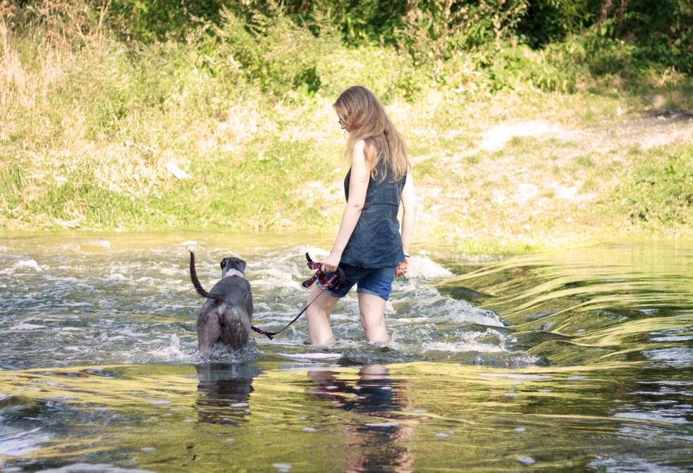 Rosi geht ruhig an der Leine – aber auch sie hat den Greyhound