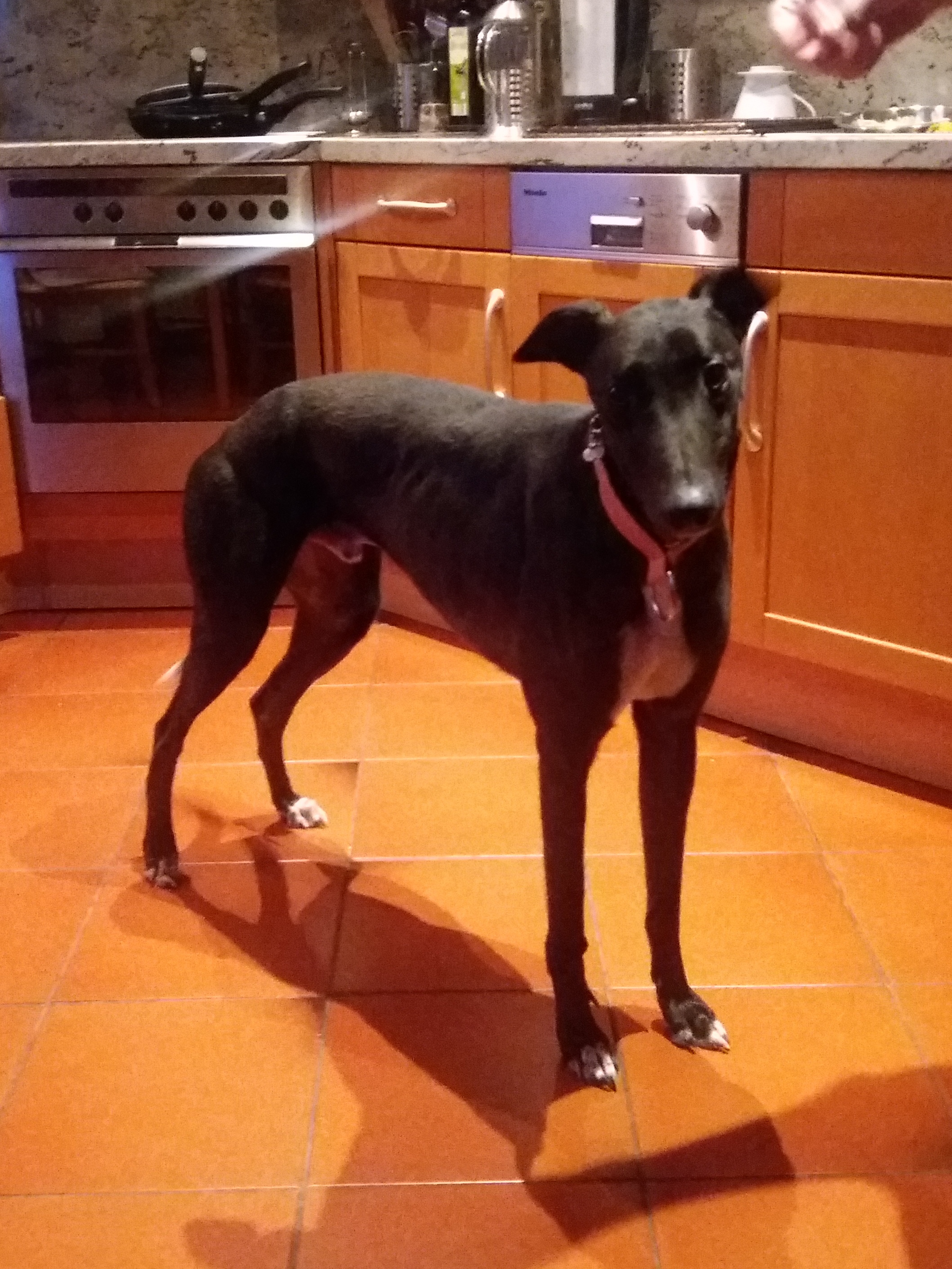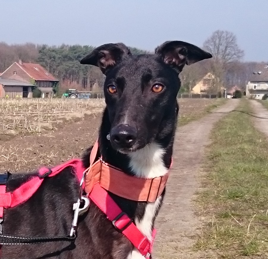 Mit seiner Schulterhöhe von 70cm ist er ein hübscher, großer Greyhoundrüde, der sich dennoch mittlerweile gut führen lässt und der mit seinem jungen Alter noch viel sehen und erleben will. Ohne, dass wir bisher mit ihm trainiert haben, versteht er bereits die Kommandos „Komm“ und „Bleib“ und erlernt auch im Alltag durch Beobachten seiner Menschen schnell die richtigen Verhaltensweisen.