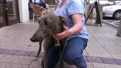Eila kam einige Minuten später dazu. Im Schlepptau hatte sie eine kleine blaue Greyhündin, kein Jahr war sie alt. Sie wurde an eben diesem Morgen in Limerick im Pound abgegeben und man benachrichtigte Eila umgehend. Natürlich holte Eila sie dort sofort ab und so genossen wir unseren Kaffee zu viert.