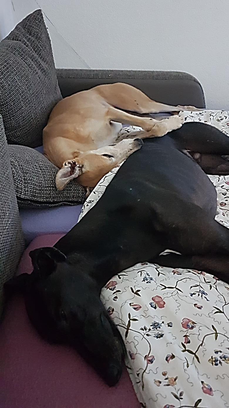 Ich fühle mich wieder sicher, denn ich kam zu meinen neuen Pflegeeltern mit einem schwarzen, wunderschönen Grey-Rüden namens Bowie, der mir die schmerzhafte Lücke in meinem Herzen wieder mit Geborgenheit und Freude am Leben füllte.