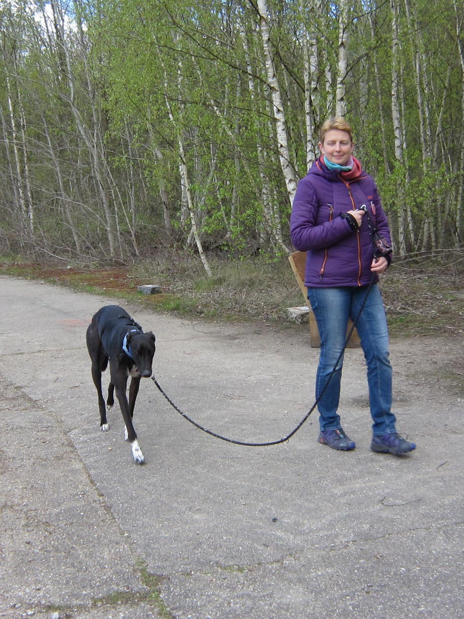 Aidan ist ruhig und entspannt an der Leine, auch wenn Wild oder Katzen seinen Weg kreuzen. Er verfolgt diese gespannt mit seinem Blick und lässt sich ohne Probleme weiterführen.